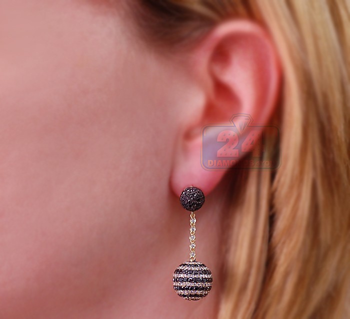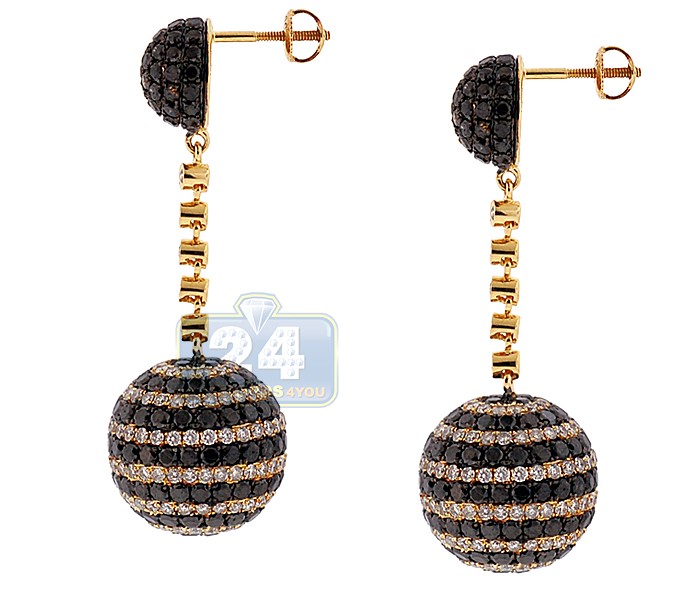 We are always on the lookout for something special, unique piece of jewelry that has an almost magical ability to boost our confidence... like these diamond ball earrings. Black and white diamonds of 10.79 carats create electricity against a sizzling 14k yellow gold and make a sparkling statement for your special occasion. They also have dangling length of 45 mm and width of 15 mm.