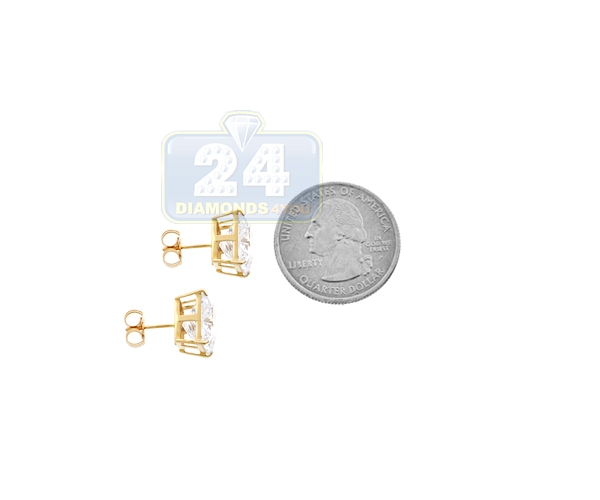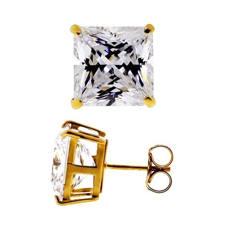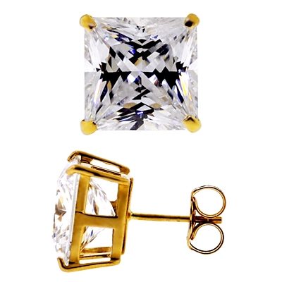 Set with two high-quality princess-cut cubic zirconia stones of 10 mm that equivalent to 11.10 carats, these stud earrings have brilliance of real diamonds! Four-prong basket is made of warm 14k yellow gold, and features a push back closure. This pair of extra-large studs is designed to emphasize your handsome style!