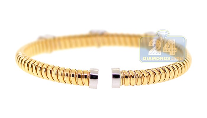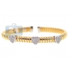 Get lots of compliments when you choose our diamond cuff bangle! Ably manufactured from warm 14k yellow gold, it features ultra-sparkling polished finish. The hearts are made of 14 karat white gold, and adorned with icy white round brilliant-cut genuine diamonds of 1.10 carat. This women's heart bracelet measures length of 6.5 inches, and width of 9 mm. Amazing piece of jewelry!