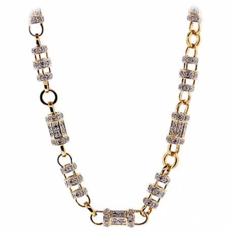 You'll be looking for excuses to wear our handsome diamond link chain! Smartly produced from warm 14 karat yellow gold, it's highly polished for very shiny smooth finish. The bar links are accented with lustrous white round brilliant-cut natural diamonds totaling 12.47 carats, SI1-SI2 clarity and G-H color. This men's diamond necklace measures 30 inches in length, 6 mm in width and approximately 72.5 grams in weight. The piece is secured by a classic lobster clasp. Stand out with the diamond bullet chain!