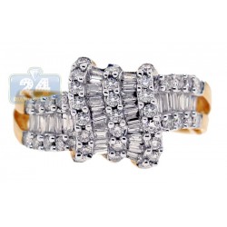 Our impressive antique styled ring features a timeless royal design and showcases an intricately shaped crown adorned with plenty of natural icy white diamonds. Round (0.61 carat) and baguette (0.61 carat) cut diamonds are skillfully handset in high polished 14k yellow gold setting creating a stunning tracery in the middle. The shoulders of the ring are gorgeously encrusted with sparkling precious stones as well. Express your real love with such an amazing ring!