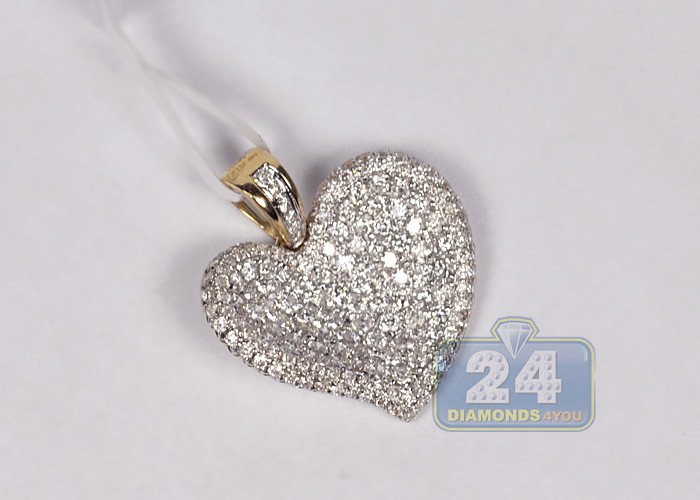 Spread the love in shimmering way with this diamond heart pendant! Masterly created from warm 1k yellow gold, it's precisely polished for ultra smooth touch. The piece is encrusted with gleaming white round brilliant-cut natural diamonds totaling 1.37 carat, SI1-SI2 clarity, G-H color. Our women's diamond pendant features 22 mm in length and 19 mm in width. Add the unique concave heart pendant to your collection!