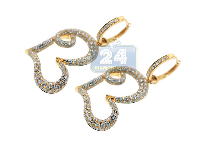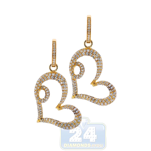 These beautifully sculpted open heart earrings hang at a slant and showcase gorgeous icy white round brilliant-cut natural diamonds of 1.80 carat. Artfully crafted in hot 14k yellow gold, they have highly polished shimmering finish. Our women's diamond earrings measure 45 mm in hanging length, and the hearts are 35 x 24 mm. Add a romantic look to your outfit!