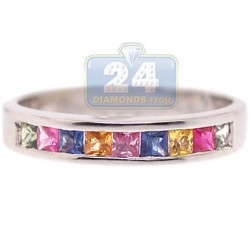 Get ready to put a small gorgeous rainbow on your finger! This eye catching ring features a stunning combination of natural colorful sapphires weighting approximately 1.94 carat in total. Absolutely elegant setting is masterly handmade of warming 14k yellow gold with perfectly polished shiny finish. It securely holds two rows of yellow, pink, blue and green princess cut sapphires. What a great gift for yourself or someone close to your heart!