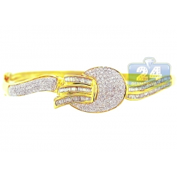 Versatile glimmer and unique design give this diamond bangle bangle an enchanting WOW factor! Professionally made of warm 14k yellow gold, it has highly polished smooth finish with bright white rhodium accents. The piece is encrusted with a combination of icy white baguette-cut (0.75 carat) and round-shaped (1.25 carat) natural diamonds. Our women's diamond bracelet has inner length of 7 inches, and its width varies from 5 to 16 mm. Make a sparkling statement wearing this piece of jewelry!