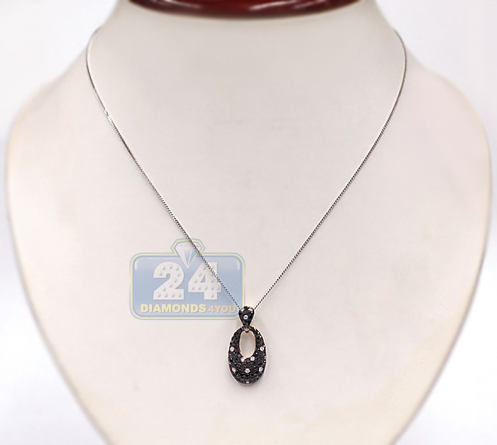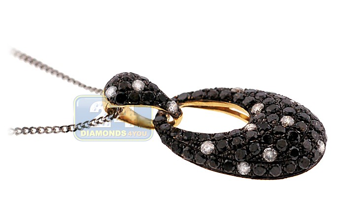 Delicate and mysterious, this black diamond pendant features unique drop design! It's masterly produced from warm 14 karat yellow gold, and polished for very smooth feel. The oval-shaped pendant is paved with icy white and treated black natural diamonds weighting 2.03 carats. Our women's diamond pendant features 30 mm in hanging length and 15 mm in width. The charming piece of jewelry looks both classic and stylish!