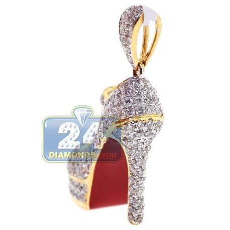 Our red sole shoe pendant is a great choice for attending fancy events! Precisely manufactured from hot 14 karat yellow gold, the piece is highly polished for smooth sparkling finish. The sole is covered with contrasting red enamel. The shoe pendant for women is studded with lustrous white round brilliant-cut natural diamonds weighting 2.03 carats. It also measures 31 mm in total height, 20 mm in length and 10 mm in width. This diamond high heel pendant is certainly lady's best friend!
