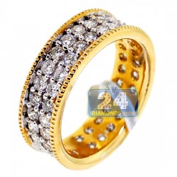 Here is a graceful and splendid two-row diamond eternity band to add extra chic to your look! It is professionally handmade of warm 14k yellow gold, finished with a special antique cut on sides, and expertly encrusted with icy white round brilliant-cut diamonds totaling 2.12 carats. The brilliants are SI1-SI2 clarity, G-H color and absolutely eye clean. The featured band weights approximately 7.3 grams and has 7 mm width. With this diamond eternity ring, you will shine from any angle! A certificate/appraisal included.