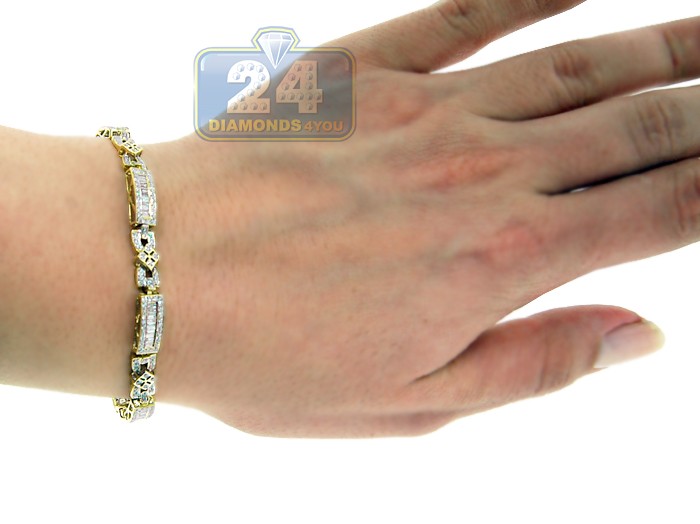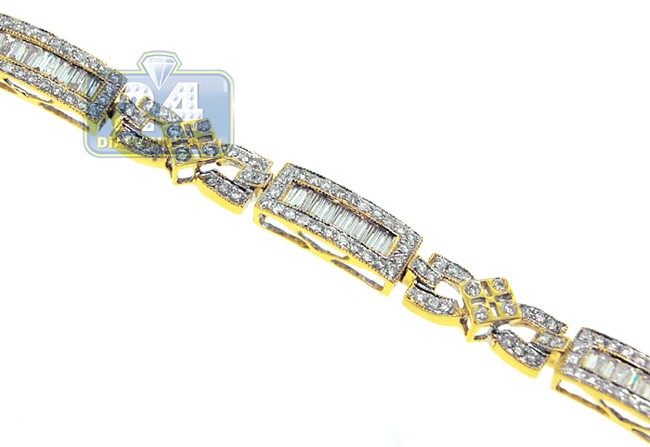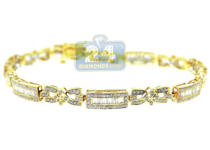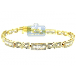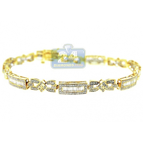 Take a look at our gorgeous diamond link bracelet for a stylish lady! Masterly created from warm 14 karat yellow gold, it has highly polished smooth finish. The link are encrusted with 2.43 carats of gleaming white round brilliant and baguette-cut natural diamonds. The piece features 7.5 inches in length and 5 mm in width. Make a classy statement wearing this women's diamond bracelet!