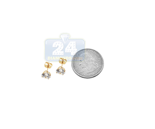 Featuring two highest quality 7 mm cubic zirconia that equivalent to 2.50 carats, these stud earrings sparkle like real diamond piece of jewelry! Four-prong setting is produced from warm 14k yellow gold, and secured with push back clasp. This pair of brilliant studs is perfect for your special evening.