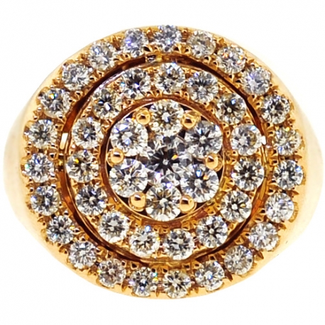 Truly exceptional design of our men's diamond ring will blow everyone away! Professionally crafted in warm 14k yellow gold, it features a very shimmering smooth look. The round-shaped head is set with a cluster of icy white round brilliant-cut real diamonds, all totaling 2.81 carats. The top of this diamond pinky ring measures 20 mm in width, and the shank is 5 mm. Adorn yourself with this sparkling diamond cluster ring for men!