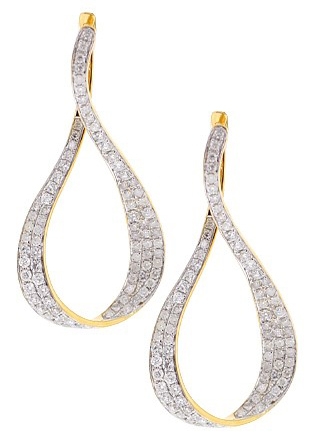 Our splendid open loop dangle earrings have an exotic and classic appeal! They're ably manufactured from warn 14k yellow gold, and high-polished for very smooth finish. These women's dangle earrings are set with 2.08 carats of white round brilliant-cut real diamonds (VS1-VS2 clarity, F-G color). They measure 42 mm in hanging length and 21 mm in width. Party-ready diamond dangles are sure to get noticed!