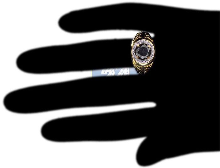 Look at this handsome jewelry piece for men! It is masterly handmade of warming 14k yellow gold with highly polished finish, and features a natural black diamond center stone that is beautifully surrounded by genuine icy white round cut diamonds. All these brilliants are eye clean and sparkling, with G-H color and SI1-SI2 clarity grades for white stones. The total diamond weight is 2.45 carat. What a stunning jewel for any occasion!