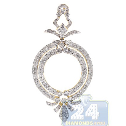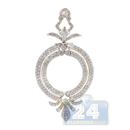 Original diamond pendant has royal design that makes this piece unique. It is ably manufactured from hot 14 karat yellow gold with high-polished shiny finish. The piece is amazed with 2.85 carats of icy white round brilliant-cut natural diamonds, SI1-SI2 clarity and G-H color. Our women's diamond pendant has dangling length of 58 mm and width of 30 mm. This royal pendant is for vintage style lovers!