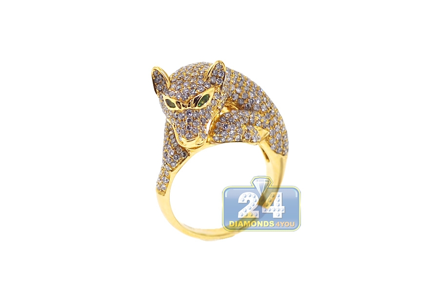 It's all about cats! Our fancy panther ring is one of a kind! The ring is gorgeously crafted in classic 14k yellow gold and beautifully encrusted with 2.92 carats of icy white round-cut diamonds and genuine green emeralds. Simply stunning jewelry piece for animal lovers!