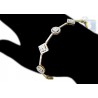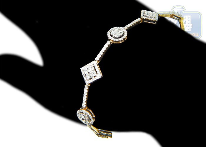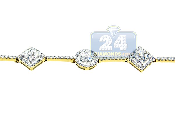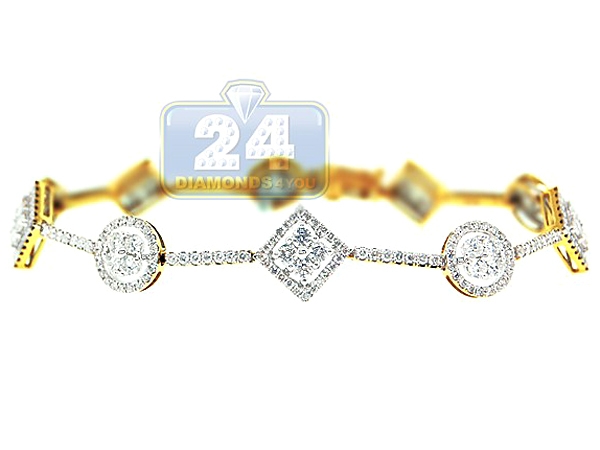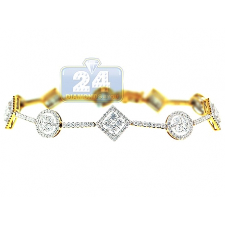 Our women's diamond bracelet features rhomb and round shaped links connected by a chain of sparkling diamonds. The setting is masterly created from warm 14 karat yellow gold with precisely polished smooth finish. This halo bracelet is set with 3.16 carats of icy white round brilliant-cut real diamonds. It features 8 inches in length and 10 mm in width. Get a touch of chic style!