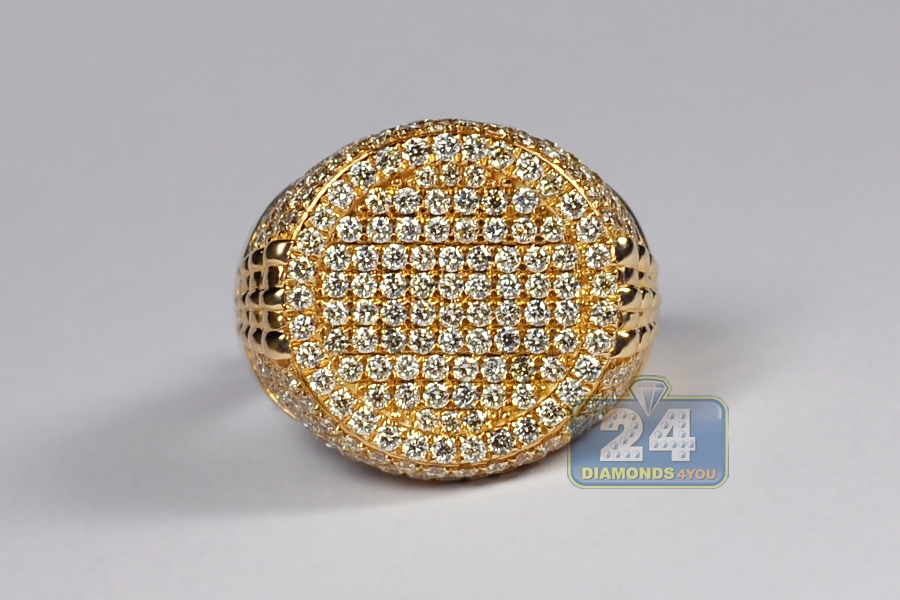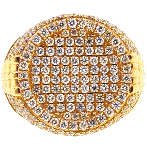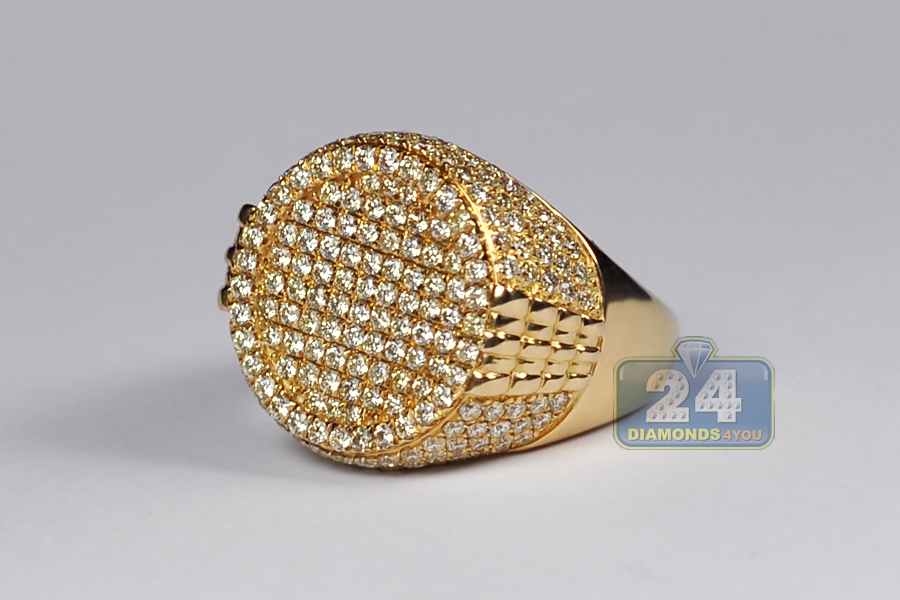 Experience luxurious elegance with our men's diamond ring which has original stepped sides! Professionally crafted in warm 14k yellow gold, it features a high-polished shimmering look. This pinky ring is encrusted with lustrous white round brilliant-cut real diamonds, all weighting 3.55 carats. The head measures 21 mm in width, and the shank is 4.5 mm. Incredible brilliance and modern design come together in our diamond signet ring!