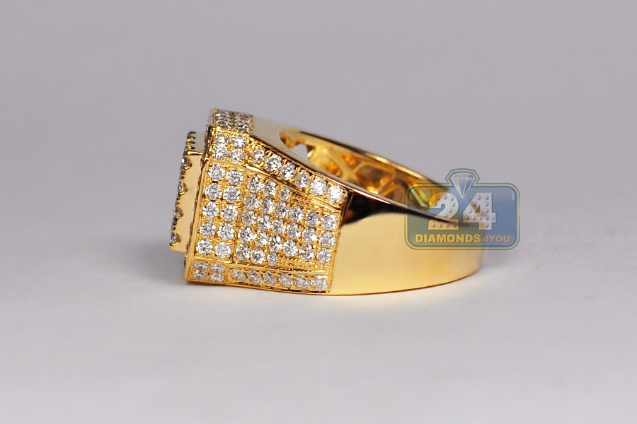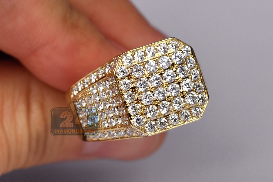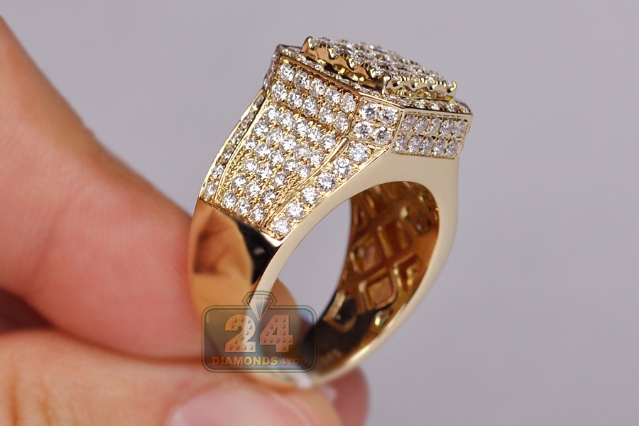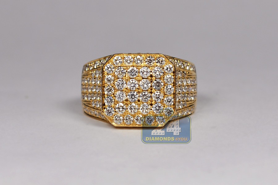 Our exclusive eye catching design adds extra sophistication to any male jewelry wearer! This special jewelry piece is expertly handcrafted in classic 14k yellow gold with highly polished finish, and handsomely encrusted with natural 164 round cut diamonds totaling 3.96 carats. Each brilliant is amazingly white, sparkling and eye clean, featuring G-H diamond color and SI1-SI2 clarity. Don't be shy and put this head turner on your finger!