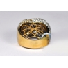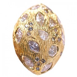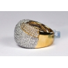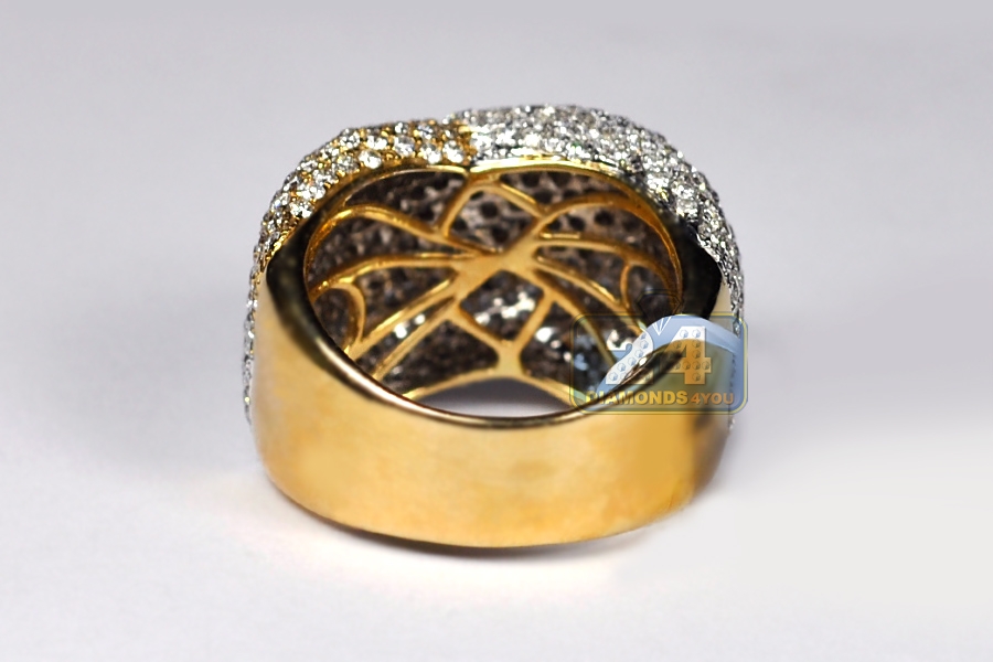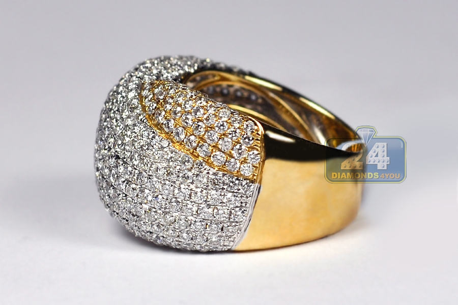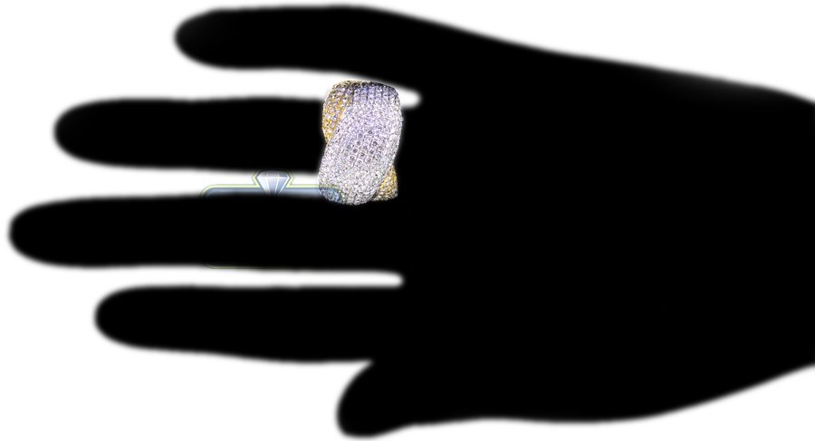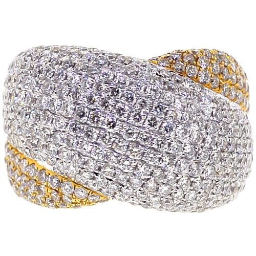 Our women's crisscross ring is a must-have collector's item! It's masterly created warm 14k yellow gold with high-polished shiny finish. There is also white rhodium accent in the center that gives bright contrast. The piece of jewelry is encrusted with icy white round brilliant-cut natural diamonds totaling 4.02 carats. The top measures 16 mm in width. This diamond dome-style ring has truly a one-of-a-kind design that will stay with you forever!