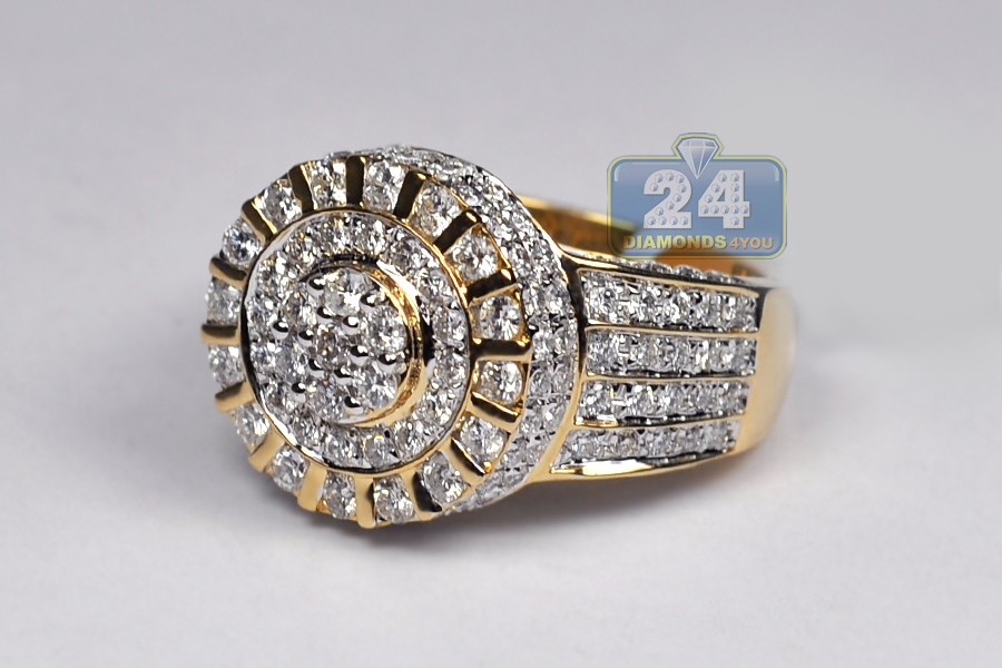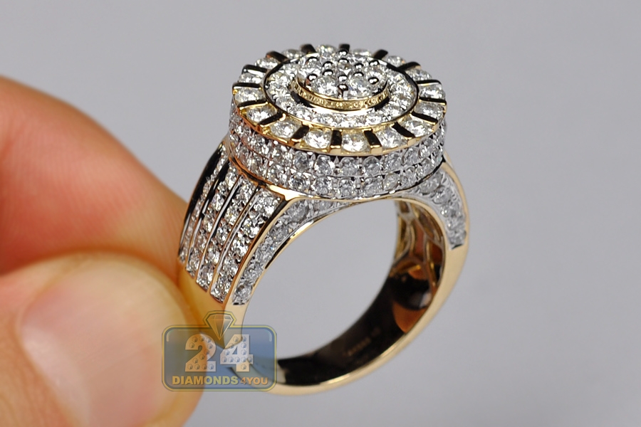 Breathtaking creation, our diamond round ring is an exotic find for upscale men! It is artfully made of warm 14k yellow gold, and carefully polished to get ultra shiny smooth finish. The head and shoulders of this pinky ring are encrusted with 4.04 carats of icy white round brilliant-cut genuine diamonds. Round-shaped top measures 18 mm in width, and the shank is 5 mm. Our mens diamond ring is the red carpet worthy of...