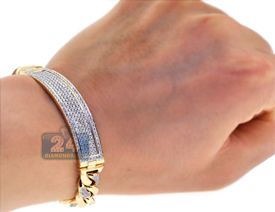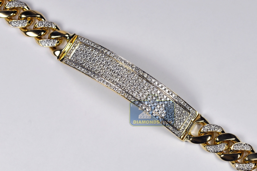 If you're looking for the piece to stand out of the crowd, this men's diamond cuban link bracelet is a ideal choice! Masterly crafted in solid 14k yellow gold, the ID plate as well as cuban links are amazed with 4.21 carats of icy white round brilliant-cut genuine diamonds. The piece measures 9 1/4 inches in length, 10.5 mm in width and approximately 71 grams in weight. This ID bracelet is a stunning example of sophisticated style!