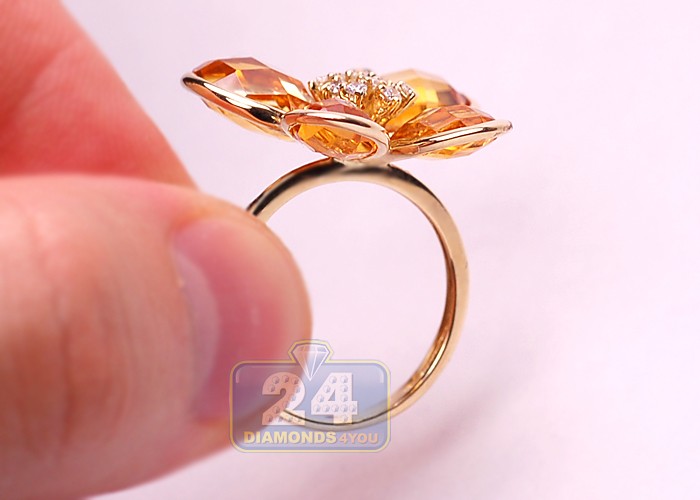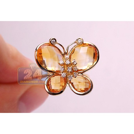 Absolutely natural and simply breathtaking! Our gemstone cocktail ring showcases a lovely butterfly design with the wings spread wide open. They are gorgeously handset with four genuine yellow citrines as well as icy white diamonds in the center and on the feelers. The setting of the ring is expertly handmade of warming 14k yellow gold with highly polished finish. What a splendid pattern combined with genuine materials and exceptional craftsmanship!