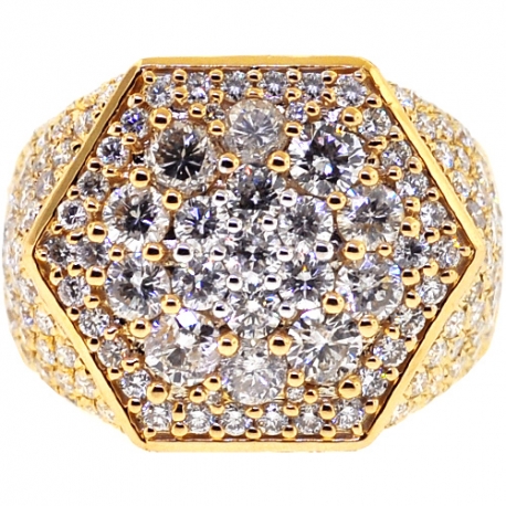 Express your sophisticated sense of style wearing our diamond hexagon ring! Expertly produced from solid 14k yellow gold, it is highly polished for ultra-smooth and sparkling finish. The top features an original hexagon shape that is encrusted with cluster of icy white round brilliant-cut genuine diamonds, all totaling 5.58 carats. The head measures 19 x 22 mm, and the shank is 6 mm. This men's diamond ring reaches the pinnacle of luxury!