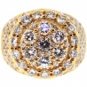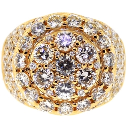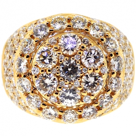 Celebrate luxurious design of our men's diamond ring that creates a smashing display! It's professionally made of solid 14k yellow gold, and high-polished for smooth shimmering look. It's studded with 6.24 carats of white round brilliant-cut natural diamonds. The round top measures 20 x 20 mm, and width of the shank is 6 mm. Original finger size is 10. This diamond cluster ring will be the conversation starter!