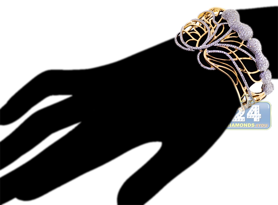 Show the world your appreciation of finest luxury wearing this diamond bangle bracelet! It is masterly handmade of lustrous 14k yellow gold, and studded with icy white round brilliant-cut diamonds totaling 6.24 carats. Our women's diamond bangle feature 7.75 inches in length and 40 mm in width. You will always look stunning in this incredibly elegant bracelet!