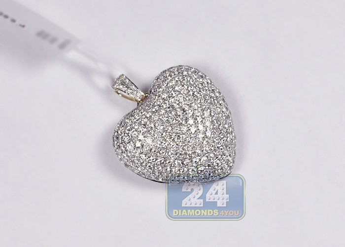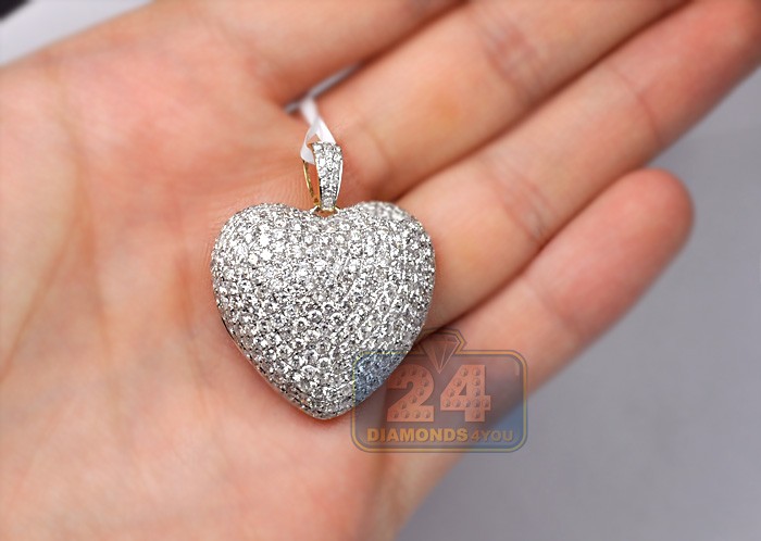 A sentimental and affectionate design, this diamond heart pendant is a chic piece! Professionally made of hot 14 karat yellow gold, it's high-polished for very smooth feel. The piece is iced out with 6.32 carats of gleaming white round brilliant-cut genuine diamonds (SI1-SI2 clarity, G-H color). Our women's diamond pendant has length of 36 mm and width of 30 mm. This diamond jewelry piece will make you feel sensational!