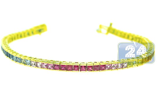 Wearing this rainbow tennis bracelet, you will make a bright statement! It's artfully manufactured from hot 14 karat yellow gold, and features precisely polished sparkling finish. It's channel set with genuine rainbow square-cut sapphires, all totaling 8.00 carats. Our women's gemstone bracelet measures 7.5 inches in length and 4 mm in width. Refresh your look with this gemstone tennis bracelet!