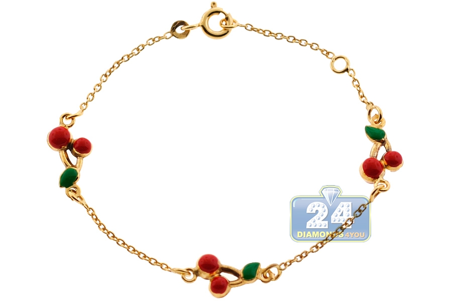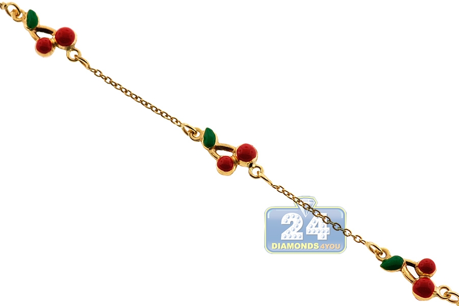 Enameled cherry charms decorate our lovely kids bracelet! It is produced from warm 14k yellow gold, and has a user-friendly spring ring closure. The bracelet is also measured 5.75 inches in length, and it can be adjusted to 5 inches. Adorable keepsake that will be cherished!