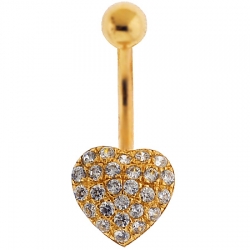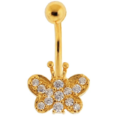 Spectacular flutter of wings is presented by our butterfly belly button ring! It is gorgeously handcrafted in warm 14k yellow gold, and encrusted with icy white round-cut cz stones of the highest quality. Fly high with this gold body piercing jewelry! Featured belly ring is handcrafted by professional jewelers with over 20 years of experience. This piece has aaa quality of round cut cubic zirconia, total length of 7/8 inches with the 12 x 10 mm butterfly size, total thickness is 14 gauge.