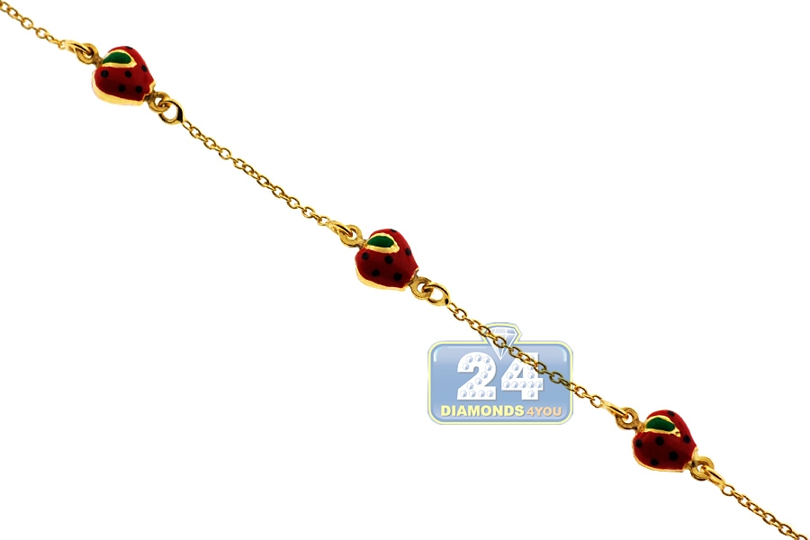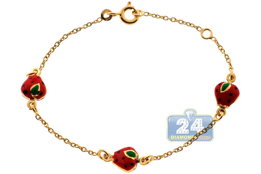 Enameled strawberry links make this kids bracelet a unique piece. It is made of lustrous 14k yellow gold, and has a user-friendly spring ring closure. The bracelet is also measured 5.75 inches in length, and it can be adjusted to 5 inches. This is an extra special gift that lasts forever!