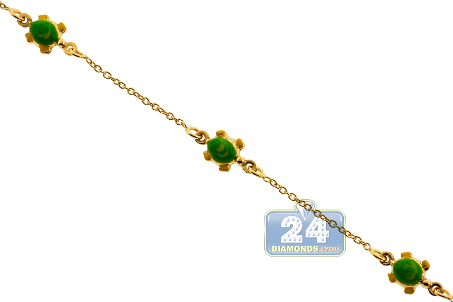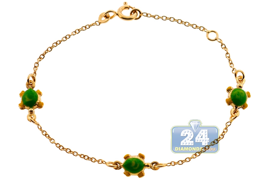 Our kids bracelet has cute turtle charms that covered with bright enamel! It is crafted in warm 14k yellow gold, and has a user-friendly spring ring closure. The bracelet is also measured 5.75 inches in length, and it can be adjusted to 5 inches. Make you child happy!