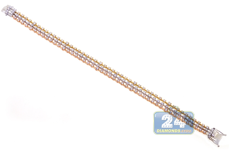 We are proud to present this diamond tennis bracelet from our rich collection! It is handmade of unique 18k gold of white, yellow and rose colors. The jewelry piece shimmers with incredible illumination and brilliance of natural icy white round-cut diamonds totaling 4.32 carats. Our women's diamond bracelet features 7.25 inches in length and 7.5 mm in width. Show your appreciation for the finest luxuries when you wear this gorgeous diamond tennis wrist bracelet!