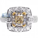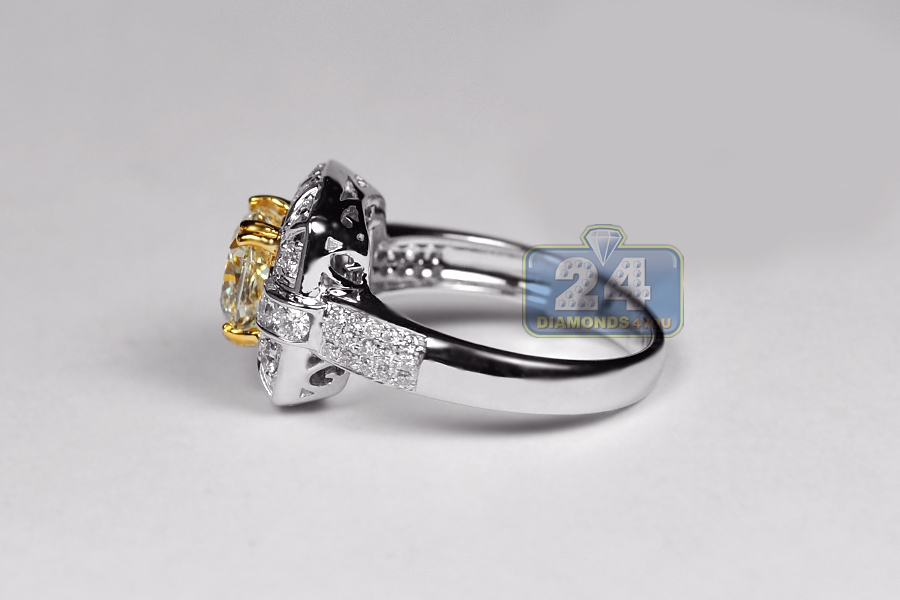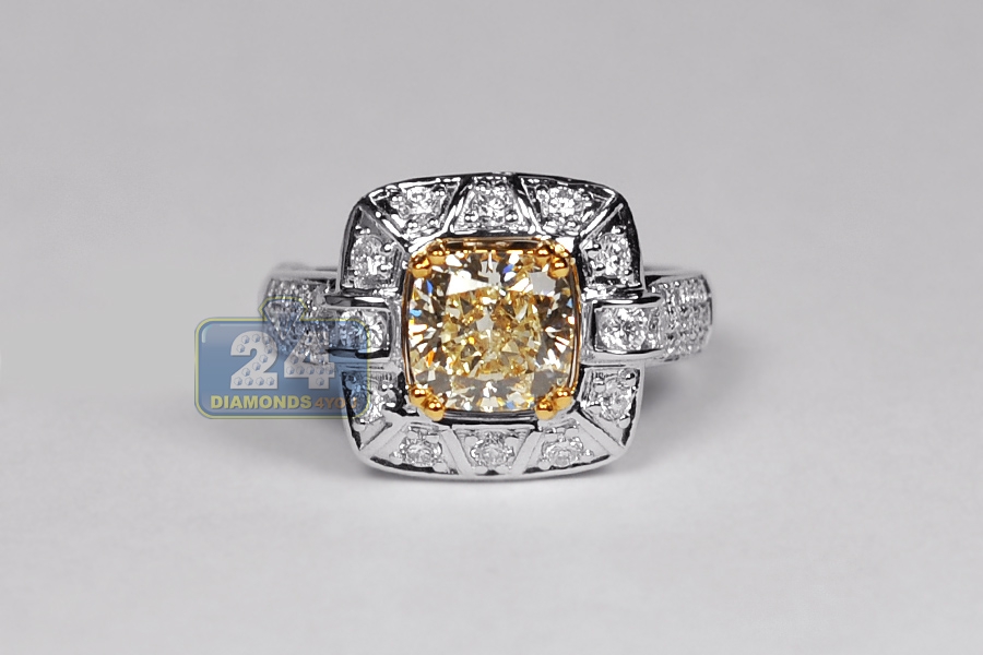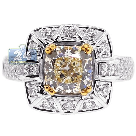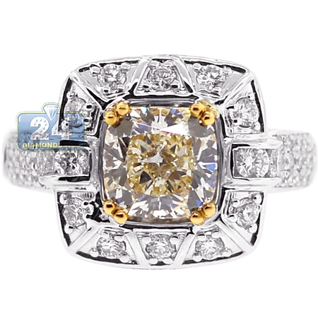 Absolutely one-of-a-kind fancy yellow diamond engagement ring will make your significant other happy! This beautiful piece is handmade of lustrous 18k white gold, and has 18k yellow gold cup that holds the center stone featuring natural fancy light yellow cushion brilliant-cut diamond (2.01 ct). It's surrounded by 0.58 carat of icy white round brilliant-cut diamonds. What a stunning jewelry piece to be a symbol of your love and commitment!