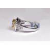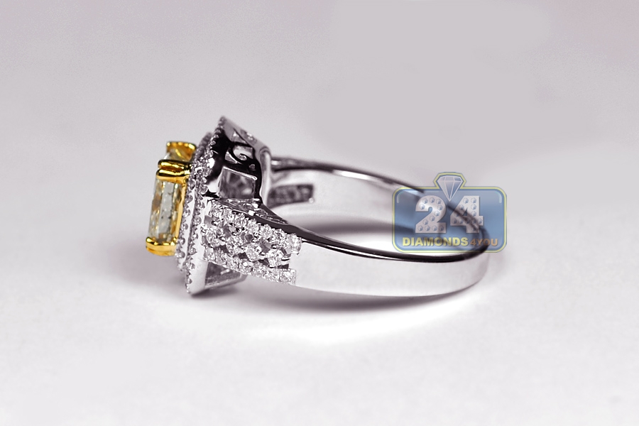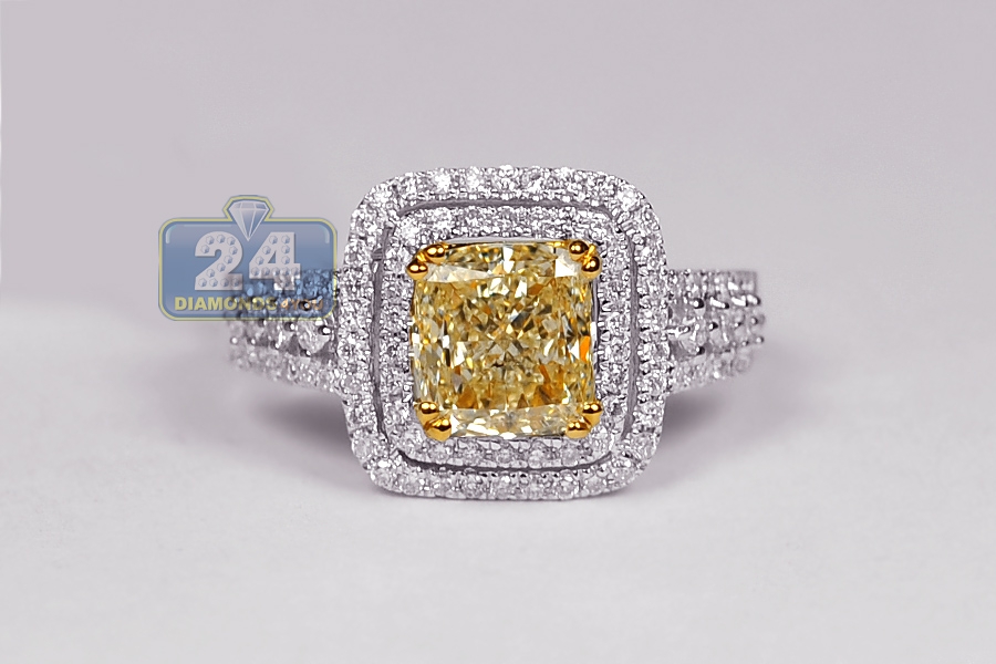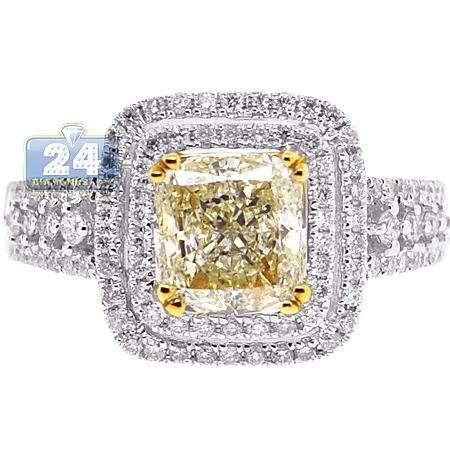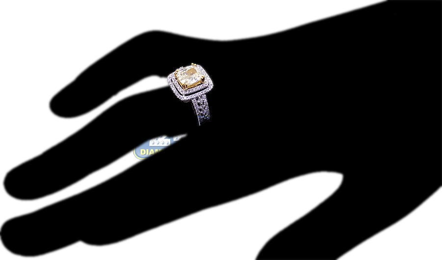 Truly fancy and beautiful! Our diamond ring features lustrous 18k white gold with perfectly polished finish, a matching 18k yellow gold cup that holds the center stone featuring natural fancy light yellow cushion brilliant-cut diamond (2.02 ct). The center is amazingly surrounded by 0.58 carat of icy white round brilliant-cut diamonds which are absolutely eye clean and sparkling. Show your feelings and commitment with such a nice color!