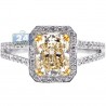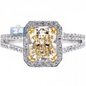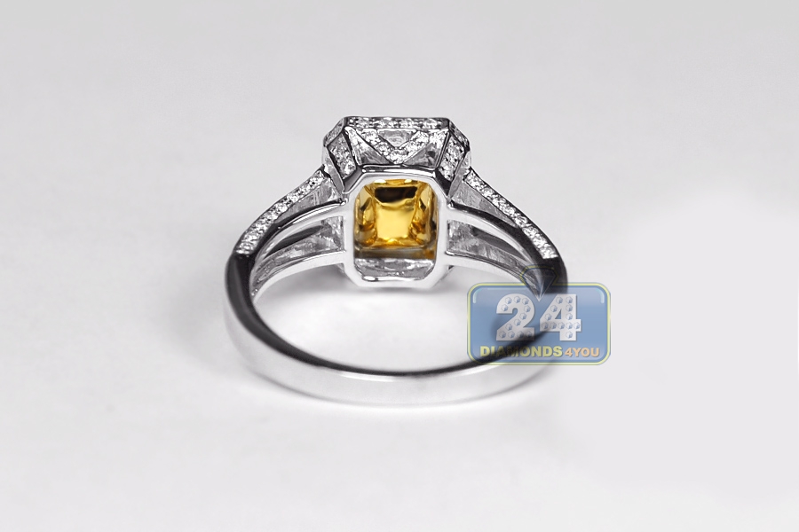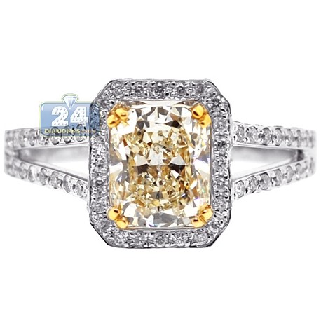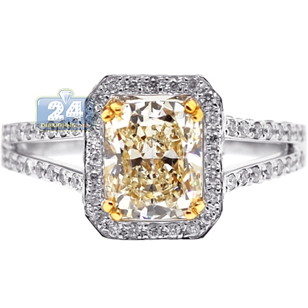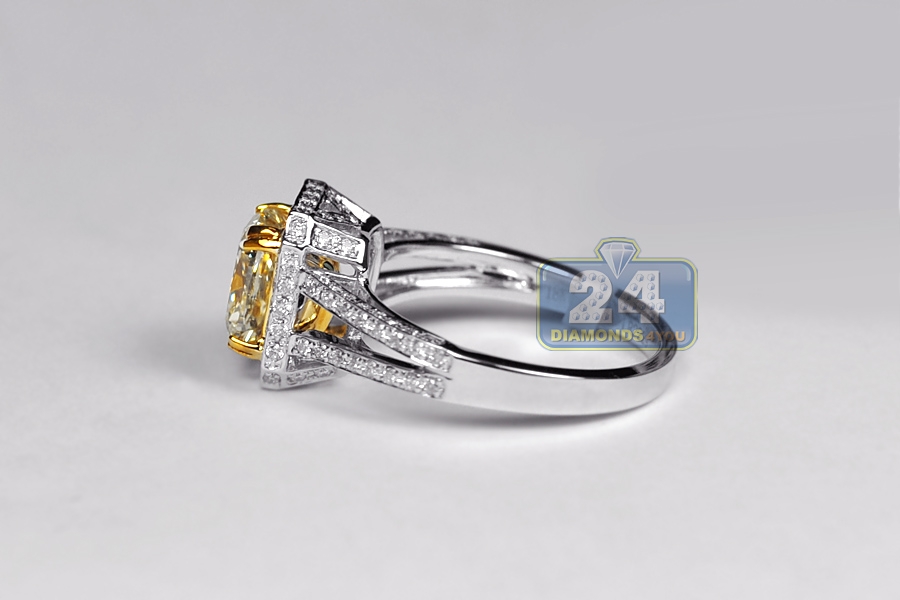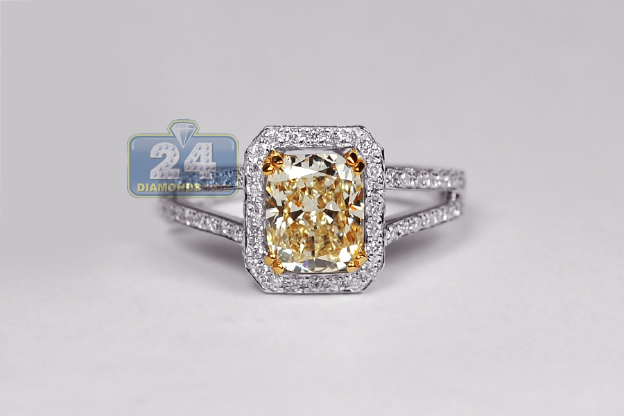 This sophisticated engagement ring is expertly handmade of cool 18k white gold with perfectly polished finish, and has 18k yellow gold cup that holds the center stone featuring natural fancy light yellow cushion brilliant-cut diamond (2.07 ct). The centerpiece is gorgeously surrounded by 0.56 carat of icy white round cut diamonds. These brilliants are absolutely eye clean and sparkling, with VS1-VS2 clarity and F-G color. What a great symbol of true love!