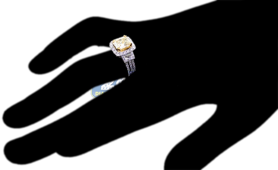 Beautiful by nature and designed by human, our genuine fancy yellow diamond engagement ring is just gorgeous! The ring is handmade of lustrous 18k white gold, perfectly polished, and has 18k yellow gold cup that holds the center stone featuring natural fancy light yellow cushion brilliant-cut diamond (2.03 ct). It's surrounded by 0.83 carat of icy white round brilliant-cut diamonds. There is no doubt, such a jewelry piece will be treasured for generations!