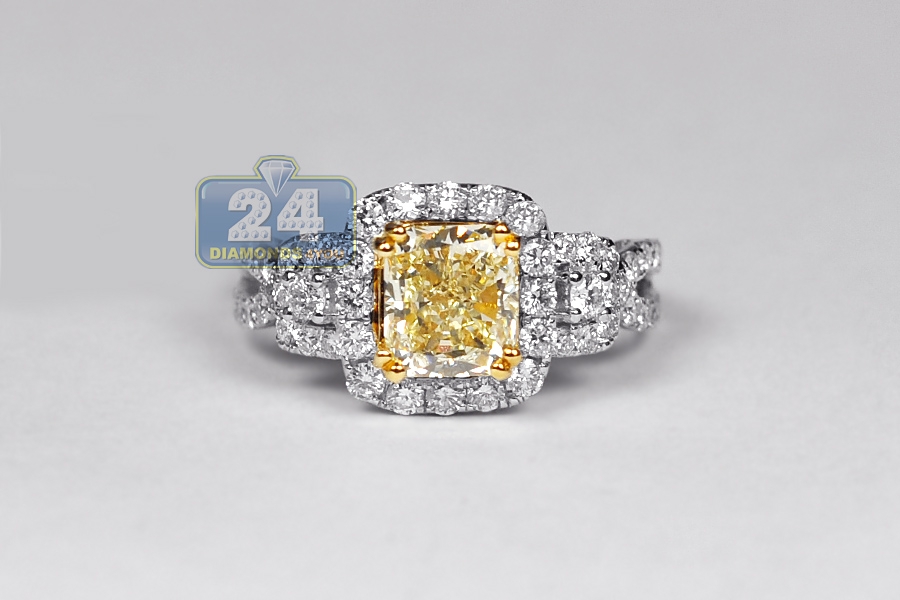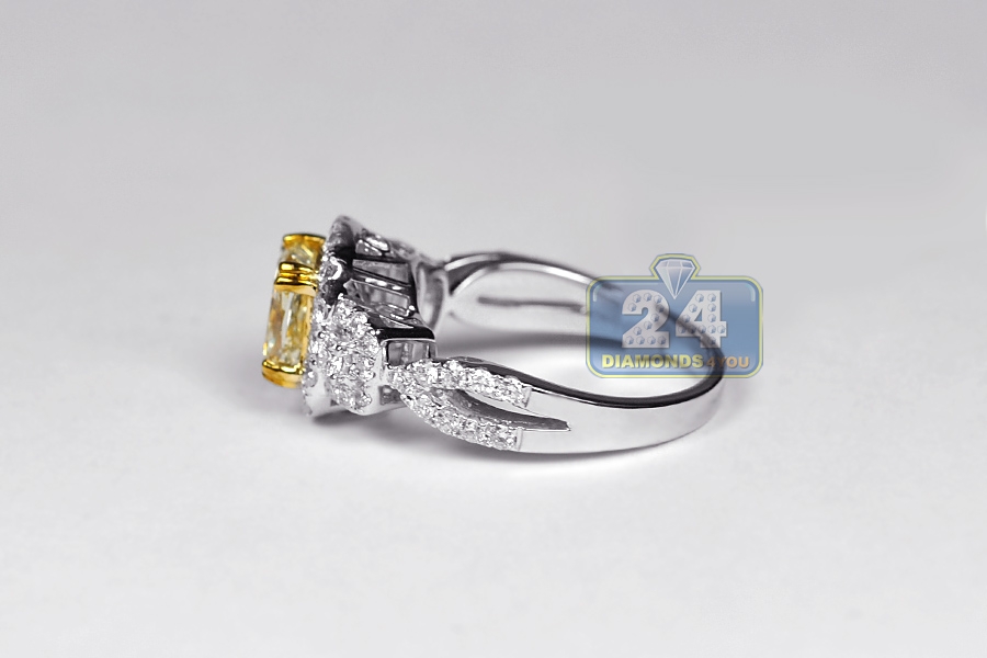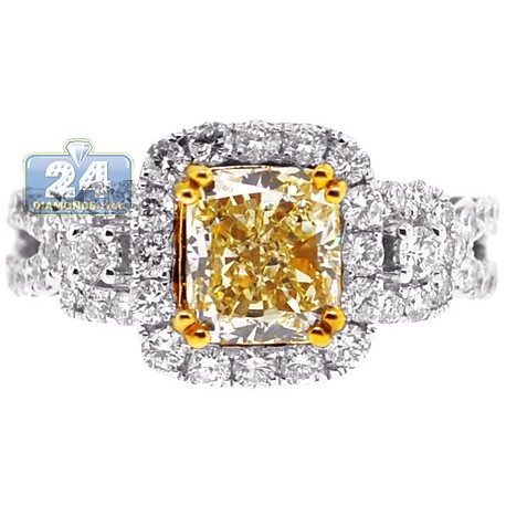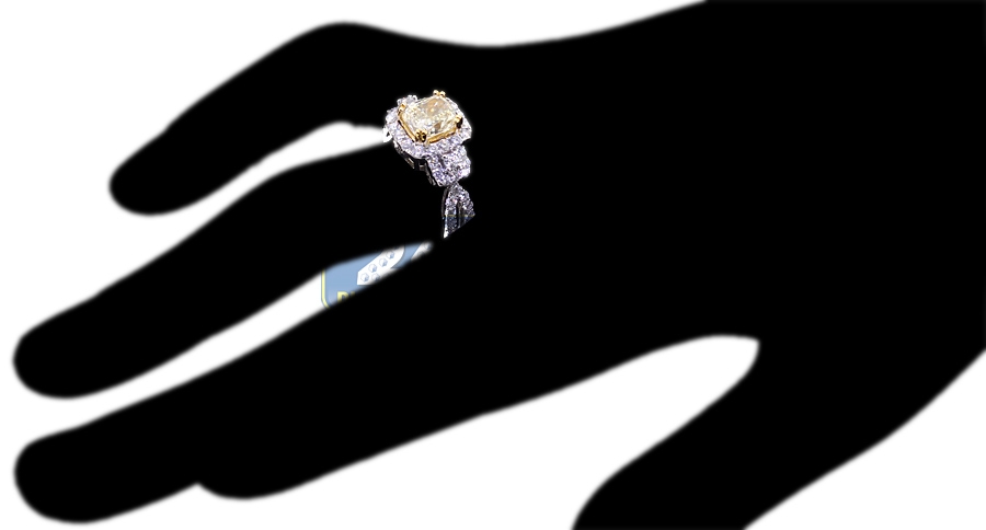 Gorgeously encrusted with yellow and white diamonds, this ring is a great engagement piece! It is professionally handmade of mixed 18k white and yellow gold with highly polished finish, and has a special cup that holds the center stone featuring natural fancy light yellow cushion brilliant-cut diamond (2.09 ct). The center stone is beautifully surrounded by 1.05 carat of icy white round brilliant-cut diamonds with F-G color and VS1-VS2 clarity. What a stylish ring to celebrate your love and official relationship!