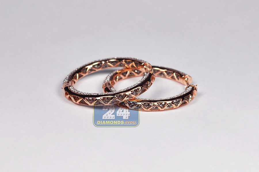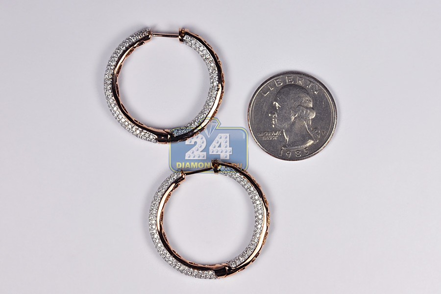 You'll look lovely wearing these inside-outside diamond round hoops! Artfully produced from rare 18 karat rose gold, they have highly polished shimmering finish. Our lady's hoop earrings are paved with 3.43 carats of sparkling white round brilliant-cut real diamonds (SI1-SI2, F-G). They feature 30 mm in hanging length and 3.5 mm in width. You must be prepared to be the object of admiring stares while wearing these breathtaking hoop earrings!