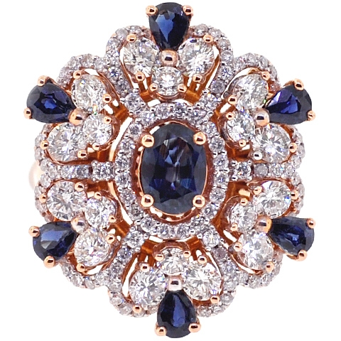 Our blue sapphire and diamond ring is nothing short of spectacular! It is professionally crafted in unique 18k rose gold; amazed with icy white round brilliant-cut genuine diamonds totaling 2.73 carats and heated blue oval-, pear-cut genuine sapphires totaling 2.18 carats. Experience the thrill of wearing this magnificent gemstone ring! This ring is a part of the set - pendant and earrings are also available.