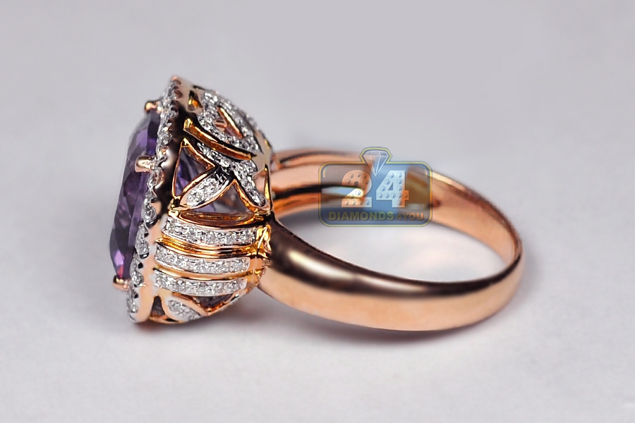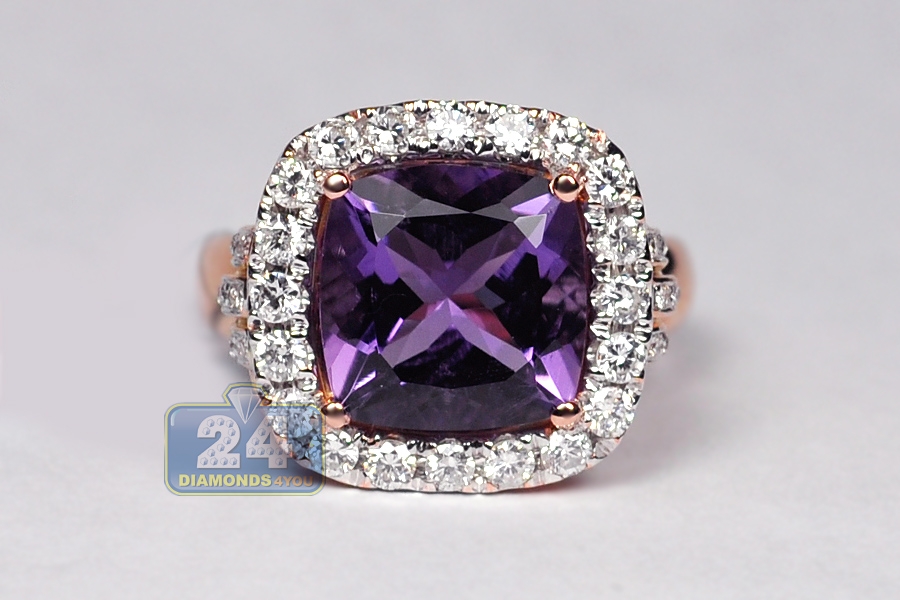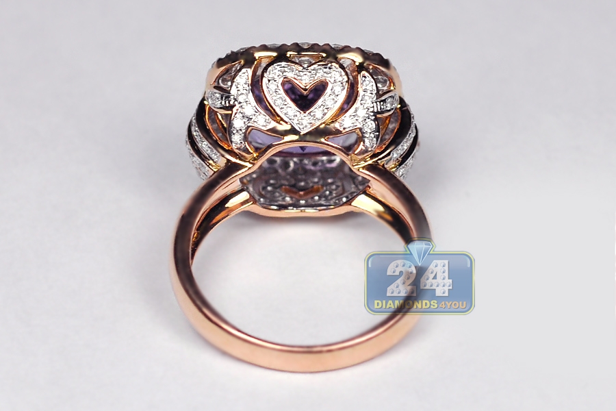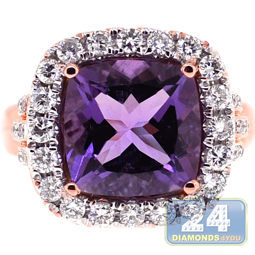 18K Rose Gold 5.84 ct Cushion Amethyst Diamond Womens Ring
