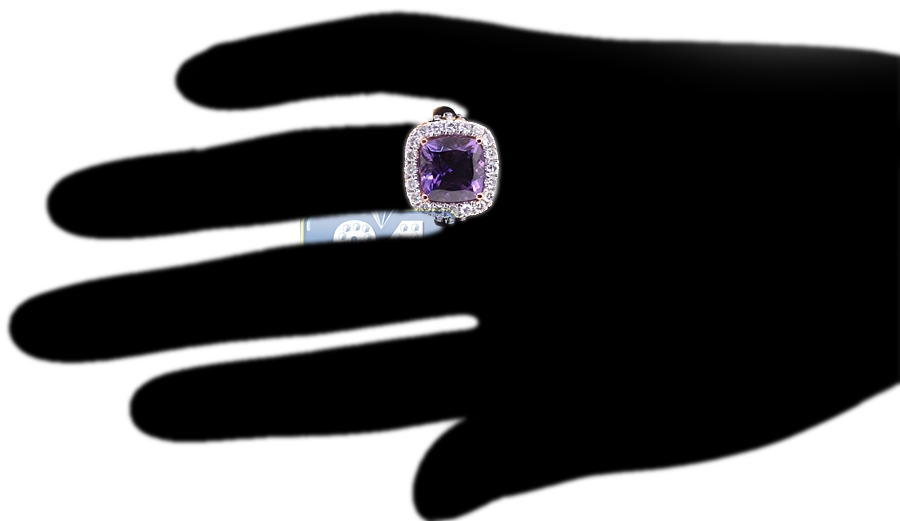 Our fabulous amethyst diamond ring is royal-worthy! It is masterly handmade of amazing 18k rose gold; and encrusted with genuine cushion-cut purple amethyst in the center (4.79 ct) and icy white round brilliant-cut diamonds on the sides (1.05 ct). A sumptuous display of luxury, quality and beauty that you will enjoy forever!