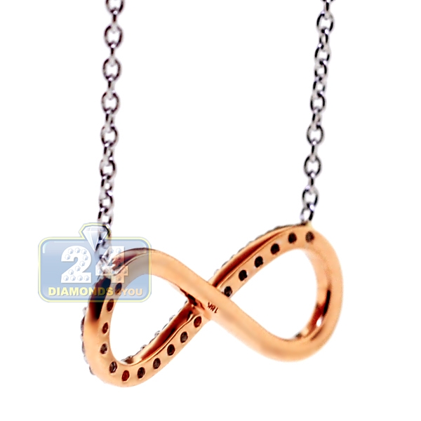You're looking at elegant diamond infinity necklace from our jewelry collection! It's ably produced from solid 18 karat gold of rose and white gold with accurately polished shiny finish. The infinity pendant is accented with 0.16 carat of shimmering white round brilliant-cut real diamonds. The diamond necklace has the length of 18 inches, and the pendant is 20 x 7 mm. Complete your evening look with our splendid women's diamond necklace!