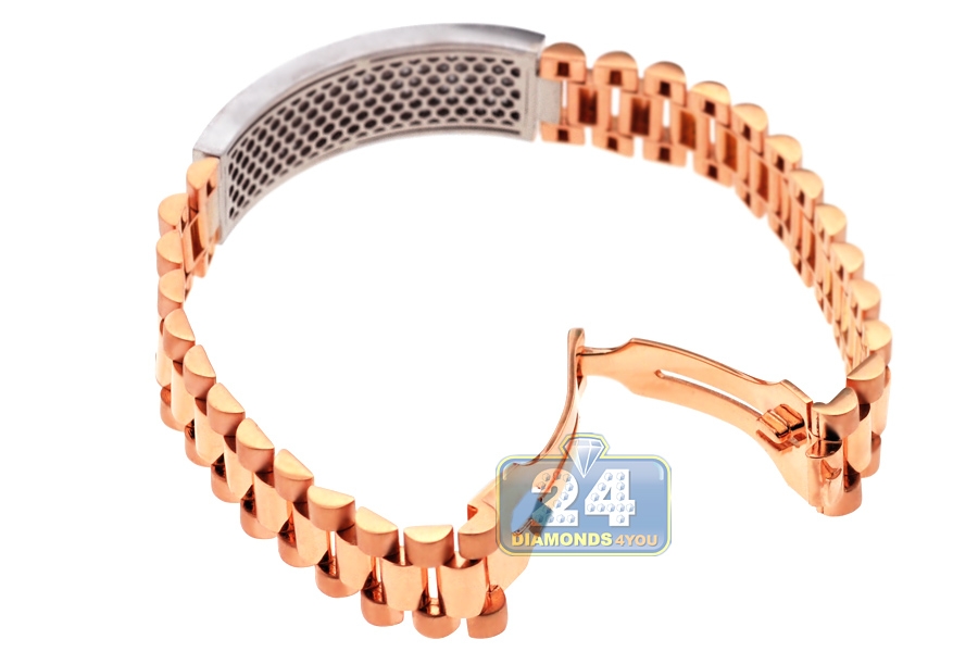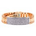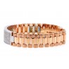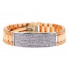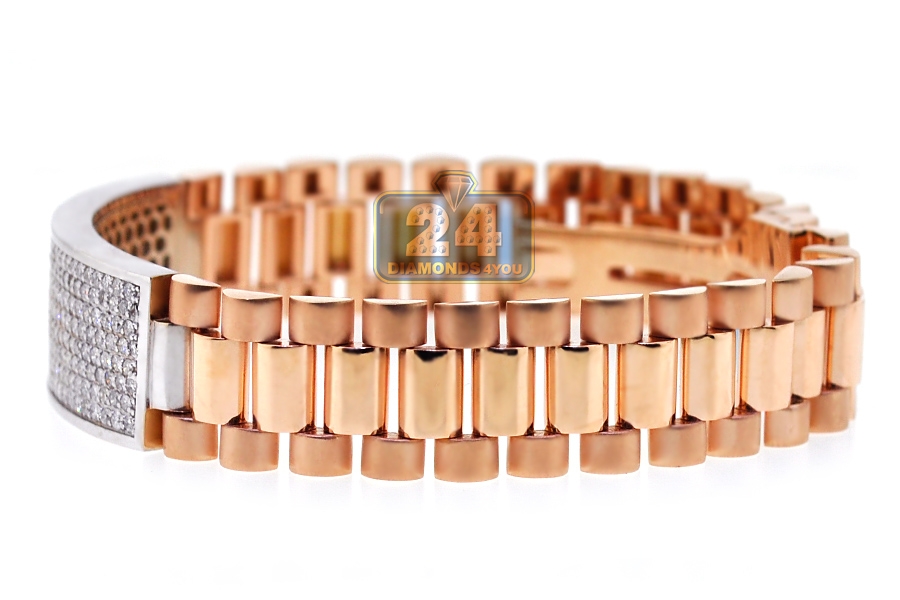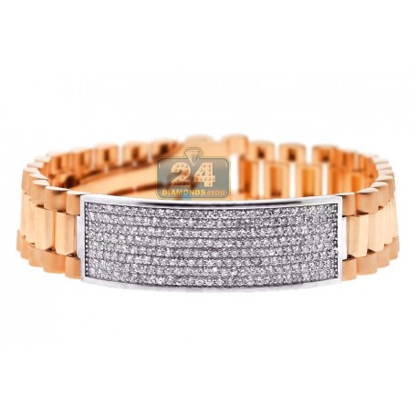 Featuring ID-style design, our handsome diamond bracelet is a must-have piece! It is professionally handmade of 18k gold of rose and white colors; and has smooth and matte finish. The bracelet is also encrusted with 4.55 carats of icy white round brilliant-cut diamonds. Our men's diamond bracelet measures 9.5 inches in length and 16 mm in width. This luxurious diamond bracelet is a perfect piece of jewelry for a sophisticated man!