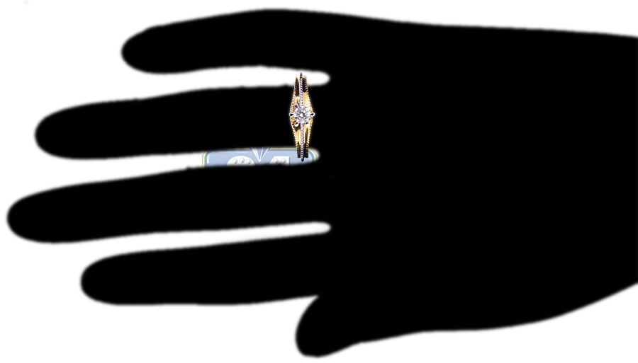 Striking and unique, this diamond solitaire ring features original pattern design! It's masterly handmade of lustrous 18k gold of yellow and white colors; and encrusted with the central icy white round brilliant-cut diamond totaling 0.25 carat. This diamond engagement ring is filled with lovely panache!