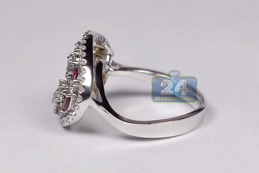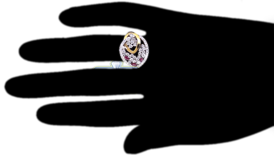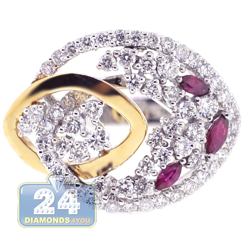 Our splendid ruby diamond floral ring is enough to make you swoon! It masterly created from lustrous 18k white and yellow gold; and encrusted with icy white round brilliant-cut diamonds (0.94 ct) and marquise-cut genuine rubies (0.18 ct). Celebration of beauty and magnificence!