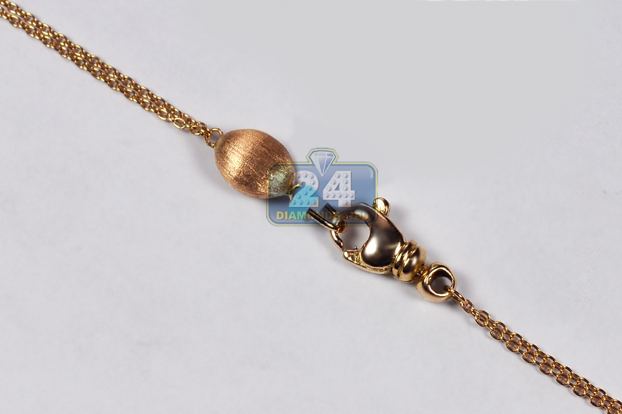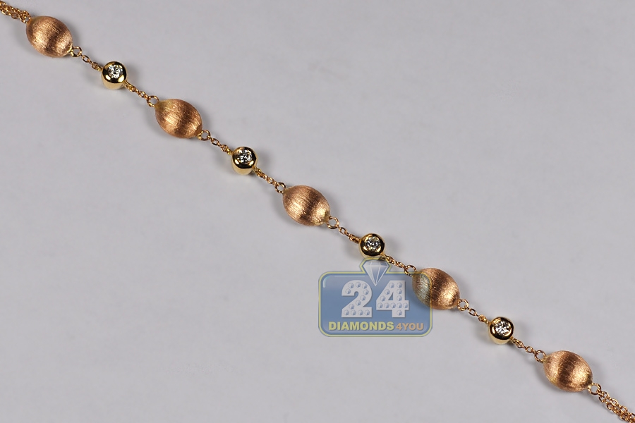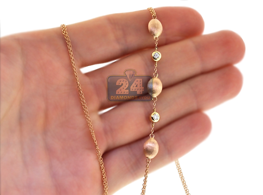 Our diamond bead necklace will look lovely on your neck! Masterly crafted in luxurious 18 karat gold of rose and yellow colors, it's accurately polished for ultra shimmering finish. The round-shaped links are bezel set with 1.22 carat of sparkling white round brilliant-cut diamonds, SI1-SI2 clarity and G-H color. Women's diamond station necklace measures length of 40 inches, width of links is 4.5 and 6.5 mm. Make unforgettable impression wearing this unique diamond beaded necklace!